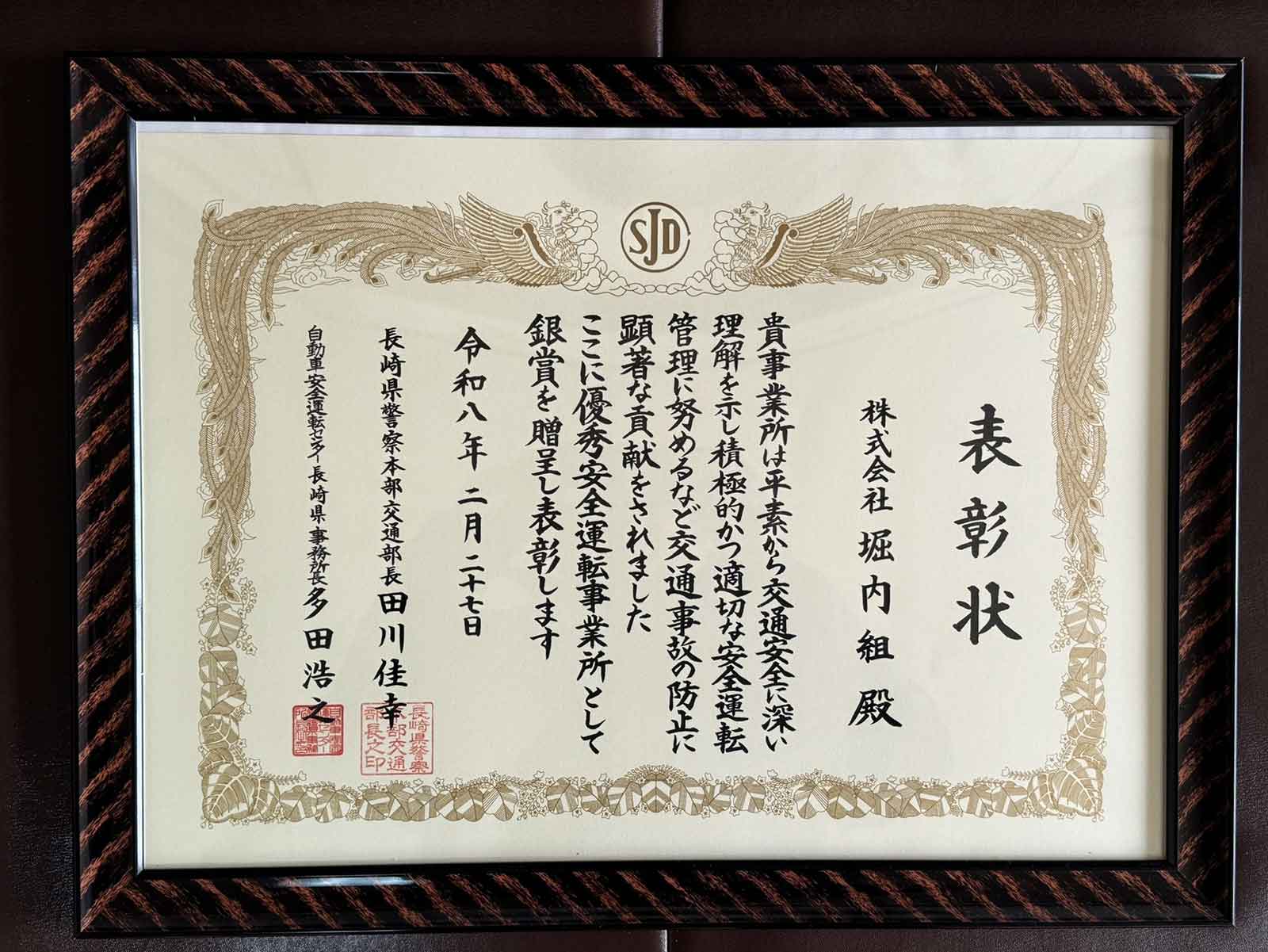 2026年2月27日、長崎県警察本部様及び自動車運転センター長崎県事務所様より、優秀安全運転事業所として、「銀賞」を受賞いたしました。