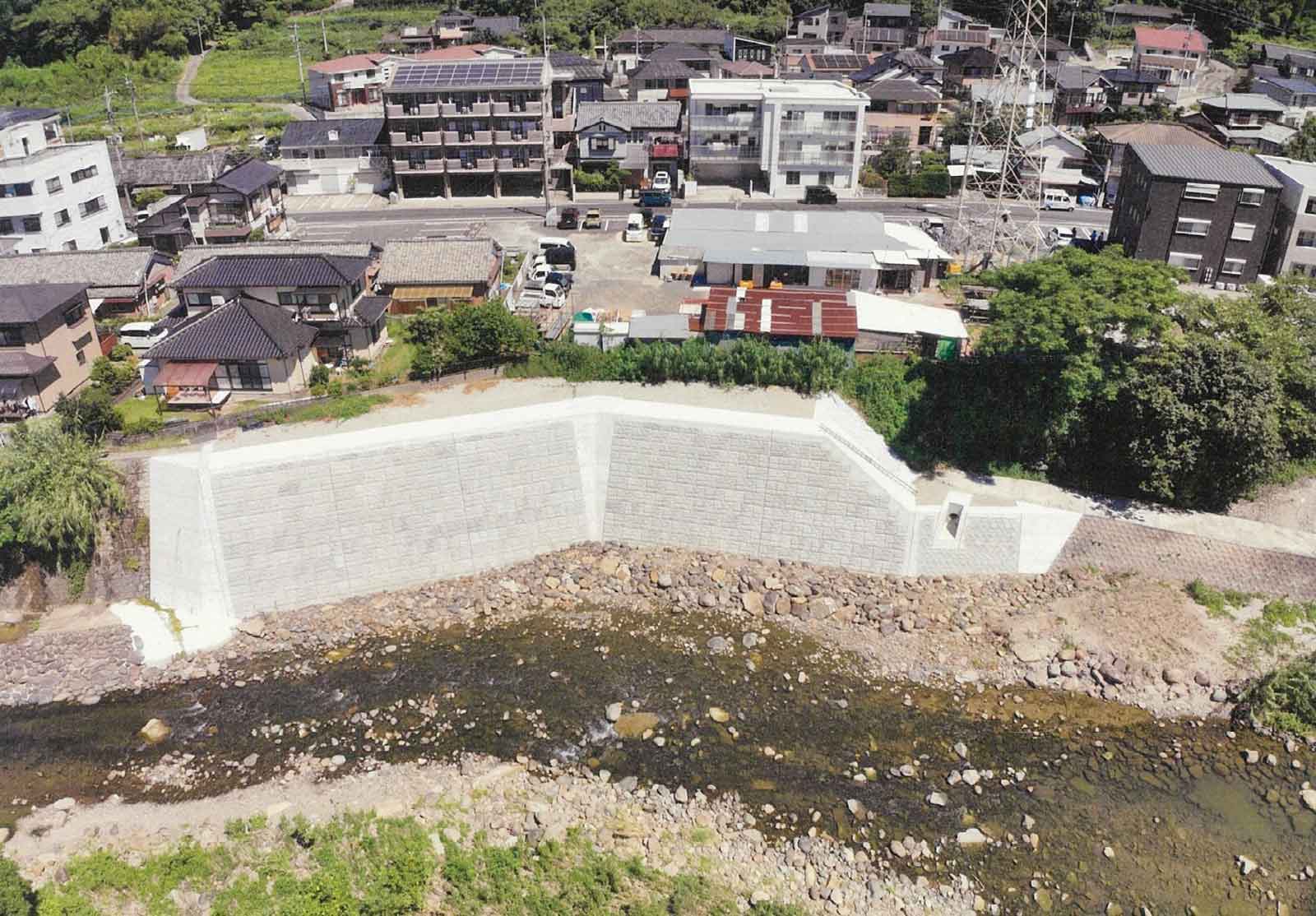 この現場は、佐世保市の相浦川の河川改修工事でブロック積み施工をしました。