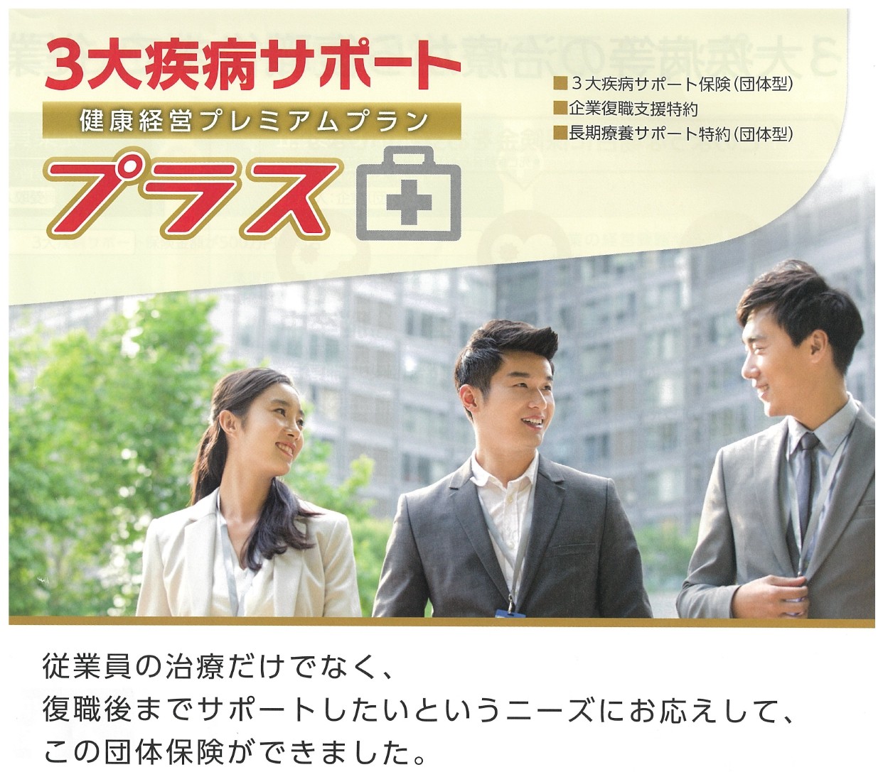 お知らせ 「3大疾病サポート保険」に加入しました。 2026年1月9日 by WEBMASTER 堀内グループでは、社員一人ひとりが安心して働き続けられる職場環境を整えるため、福利厚生の充実に取り組んでいます。 その取り組みの一環として、2026年1月より全グループ社員を対象に、第一生命保険の「3大疾病サポート保険」を導入しました。万が一の病気に備えることで、社員が治療に専念できる環境を整え、健康面・生活面・資金面を支えていきたいと考えています。 今後も、社員の安心と健康を大切にした職場づくりを進めてまいります。
